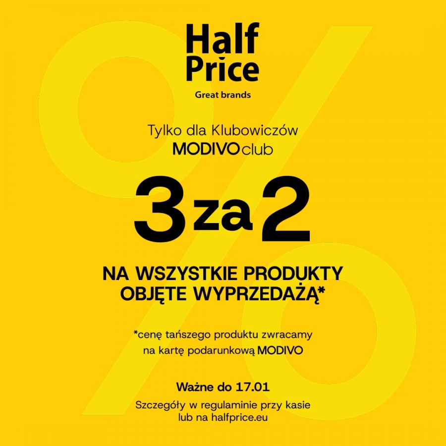 Akcja 3za2 w HalfPrice! Wybierz 3 produkty z wyprzedaży, a zwrot za najtańszy z nich otrzymasz na kartę podarunkową MODIVO! Światowe marki i wyjątkowe ceny czekają!