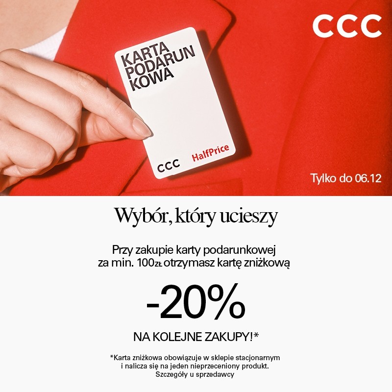 Szukasz mikołajkowego prezentu? W tym roku postaw wszystko na jedną, wyjątkową Kartę Podarunkową CCC x HalfPrice! To wybór, który ucieszy miłośników niegraniczonych możliwości! Upominek dla bliskiej osoby, a dla Ciebie bonus! Tylko do 6 grudnia kupując kartę podarunkową za min. 100 zł otrzymasz kartę rabatową 20% na jeden nieprzeceniony produkt do wykorzystania na kolejne zakupy w sklepach stacjonarnych. Udanych zakupów! Regulamin promocji dostępny przy kasie lub na stronie www.ccc.eu