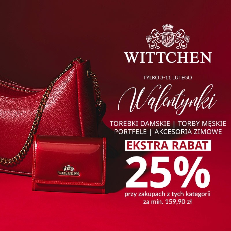 Celebruj miłość! W WITTCHEN oferta walentynkowa. Ekstra rabat 25% na torebki damskie, torby męskie, portfele i akcesoria zimowe przy zakupach z tych kategorii za min. 159,90 zł.